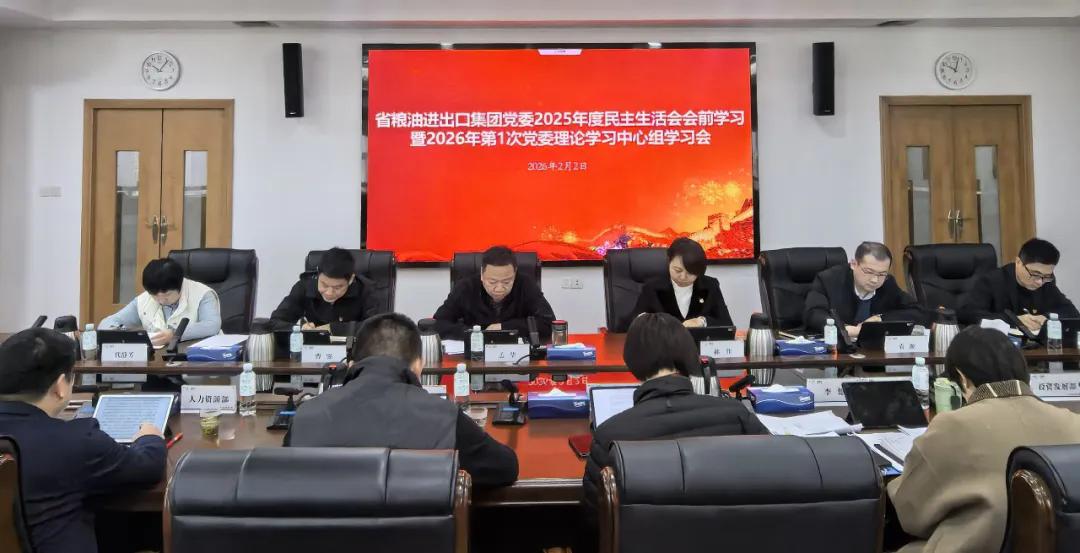 2月2日,省糧油進出口集團黨委召開2025年度民主生活會會前學習暨2026年第1次黨委理論學習中心組(擴大)學習會,深刻學習領(lǐng)會習近平總書記在中央政治局民主生活會上的重要講話精神,深入學習貫徹習近平總書記關(guān)于黨的建設(shè)、黨的自我革命、國有企業(yè)改革、“三農(nóng)”工作、加強黨的紀律建設(shè)與作風建設(shè)等重要論述和關(guān)于巡視工作指示批示講話精神。集團黨委書記、董事長孟華主持集體學習并講話,黨委班子成員結(jié)合工作實際交流思想認識和學習體會,為高質(zhì)量開好2025年度民主生活會打牢思想基礎(chǔ)。
