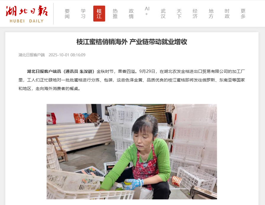 湖北日報:枝江蜜桔俏銷海外 產(chǎn)業(yè)鏈帶動就業(yè)增收
