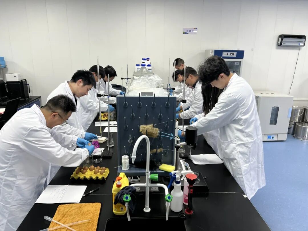 米來生物科技研發(fā)人員組成5個小組,圍繞“蛋黃收集”與“溶液標(biāo)定”等環(huán)節(jié)開展技能競賽?;顒訌牡包S蛋清分離與收集、精準標(biāo)定未知濃度氫氧化鈉溶液等方面,考驗參賽選手的業(yè)務(wù)實操、化學(xué)實驗基本功與數(shù)據(jù)處理能力。競賽現(xiàn)場,選手們精準、高效完成各項任務(wù),展現(xiàn)出高超技能水平和扎實專業(yè)功底。